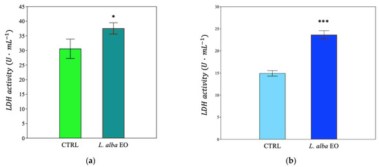 The toxic effect of EO on cell lines was further investigated by measuring the activity of the LDH enzyme, released from the damaged cells in the culture medium. LDH found in the cytoplasm catalyzes the conversion of lactate into pyruvate, reducing NAD+ into NADH. The more LDH is released in the culture medium, the higher is the cell damage [25]. Significant enhancement of LDH activity was observed in both cell lines (+23.3% and +53.3%, respectively, in MDA-MB-231 and in SUM149, compared to relative CTRL) (Figure 14a,b).