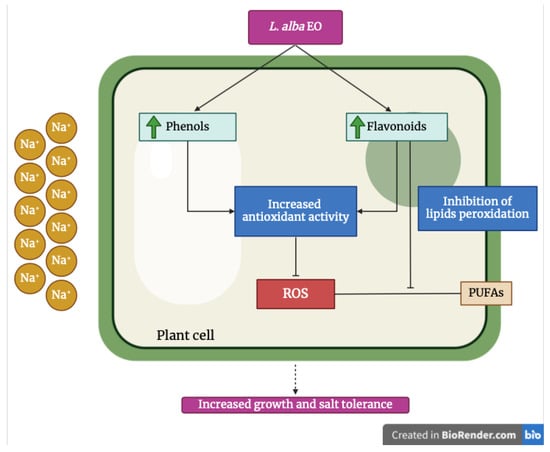 Possible mechanism of action of L. alba EO on bean and tomato cells under salt stress. In the presence of high salt concentration, primed plants increase the synthesis of intracellular phenolic compounds, enhancing their antioxidant activity, inhibiting ROS overproduction. Furthermore, flavonoids prevent lipid peroxidation, avoiding the interaction between ROS and PUFAs, which cause severe damage to the plasma membrane by producing new radical species. Created by BioRender.com (accessed on 23 July 2023).