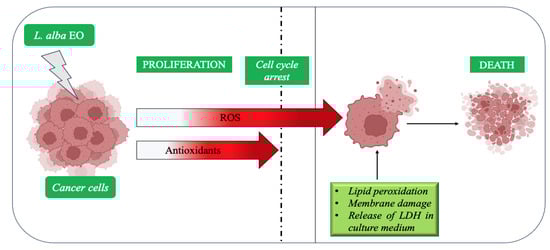 Possible mechanism of action of L. alba EO on breast cancer cells. The dotted line represents the threshold value of antioxidant capacity of the cells to overcome ROS toxicity. Above this threshold, the cells are unable to overcome the damage caused by the accumulation of ROS. (Image based and modified from [5,14]). Created in BioRender.com (accessed on 23 July 2023).