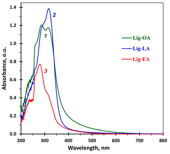 UV–visible spectra of Lig-OA (1), Lig-LA (2), and Lig-EA (3). The lignin concentration is 50 μg mL−1.