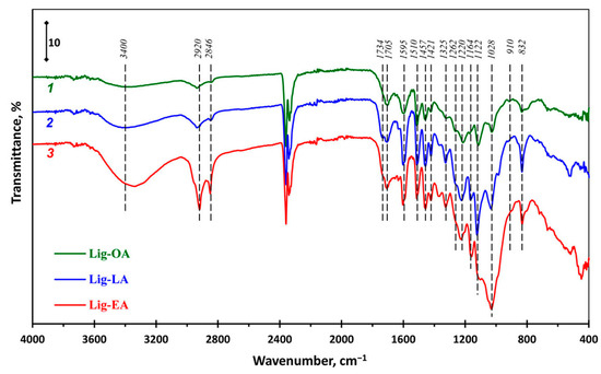 In order to study the structural characteristics of lignins, ATR-FTIR spectra of lignin samples were recorded (Figure 2). The results showed that the spectra of the three lignin samples were almost identical and were generally consistent with typical lignin spectra [40,42,43,44]. Lig-OA and Lig-LA had a broad band at 3400 cm−1 attributed to OH groups in phenolic and aliphatic structures. In the case of Lig-EA, this band was shifted to short wavelengths (3330 cm−1). All the spectra contained bands at around 2920 cm−1 and 2846 cm−1, which resulted from the asymmetrical and symmetrical stretching vibrations of the C−H bond in the methyl and methylene groups. The highest intensity of these bands was observed in Lig-EA. The carbonyl/carboxyl region of the spectra demonstrated bands at 1700–1740 cm−1 originating from unconjugated carbonyl/carboxyl stretching. At the same time, there was no signal at 1734 cm−1 in Lig-OA. Aromatic skeleton vibrations at 1421, 1510, and 1595 cm−1 and asymmetric Car–H deformations at 1457 cm−1 were common to all three lignins, although the intensity of these bands was different. This indicates that the benzene ring skeleton of the lignin samples was not destroyed during DES pretreatment. The spectral region below 1400 cm−1 is more difficult to analyze, since most bands are complex, with contributions from various vibration modes. However, this region contains vibrations specific to different lignin units, which enables a comparison of the structure of the lignin samples. In the spectra of all three lignins, vibrations of different intensities characteristic of the G (1028, 1220, 1262 cm−1), S (1325 and 1122 cm−1), and H units (1164 cm−1) were observed [40,43,45,46,47]. It should be noted that the influence of carbohydrate impurities (1000–1300 cm−1) is the most substantial in the Lig-EA spectrum. The band at 832 cm−1, which is especially intense in Lig-LA, and a small peak at 910 cm−1, can be attributed to the C–H out-of-plane deformation in positions 2, 6 and 2, 5, 6 of the aromatic ring [40,46].