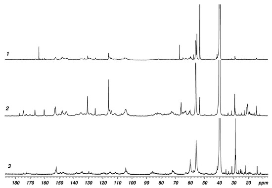Comparative analysis of the 13C NMR spectra of the lignin samples investigated in this work allows us to conclude that the greatest structural diversity is observed in Lig-LA. This lignin contains numerous carbonyl groups and oxygen-linked CH2 groups (−O−CH2−R). In contrast, Lig-OA and Lig-EA do not contain significant signals in the region of carbonyl groups. In addition, the Lig-EA spectrum contains only signals characteristic of methoxy groups attached to aromatic carbon atoms.
