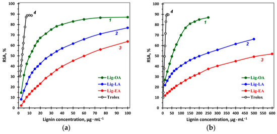 In order to evaluate the antioxidant potential of lignins, ABTS+• and DPPH• were used, which are the most widely applied and stable chromogenic radicals for measuring the antioxidant activity of biological materials. The commercial antioxidant Trolox was used as a positive control. As shown in Figure 4, the radical scavenging capacity of all three lignins rose with an increasing lignin concentration, and in both ABTS+• and DPPH• assays, the antioxidant activity decreased as follows: Lig-OA > Lig-LA > Lig-EA (Table 1). It is noteworthy that the ABTS+• free radical scavenging ability of Lig-OA was not much lower (IC50 = 10 μg mL−1) than that of Trolox (IC50 = 3 μg mL−1). The removal of the ABTS+• radical by all three lignins was much higher than that of the DPPH• radical. These differences are related to the mechanism of the reactions; the ABTS+• radical reactions involve electron transfer and occur at a much higher rate compared to DPPH• radicals [57]. Similar results were obtained by other researchers. For example, the IC50 values for BIOLIGNIN™ (lignin extracted from wheat straw) were 0.04–0.05 mg mL−1 in the DPPH assay and 0.009–0.01 mg mL−1 in the ABTS assay [58]; for lignin extracted by various methods from corncob, 0.17–0.26 mg mL−1 (DPPH•) and 0.016–0.028 mg mL−1 (ABTS+•) [59]; for industrial kraft and organosolv lignins, 3.47–5.16 μg mL−1 (ABTS+•) and 12.85–22.75 μg mL−1 (DPPH•) [60]. Tavares et al. reported an IC50 value of 60 μg mL−1 in the DPPH assay and 7.39 μg mL−1 in the ABTS assay for lignin extracted from Eucalyptus spp. sawdust [61], and Wei et. al. reported IC50 values of 262.87–1704.38 mg L−1 (ABTS+•) and 267.47–1730.82 mg L−1 (DPPH•) for lignin fractions obtained from eucalyptus kraft lignin by solvent extraction [62]. The differences in the antioxidant activity of lignin samples are related to the extraction methods, as well as to the source of lignocellulosic material [63].