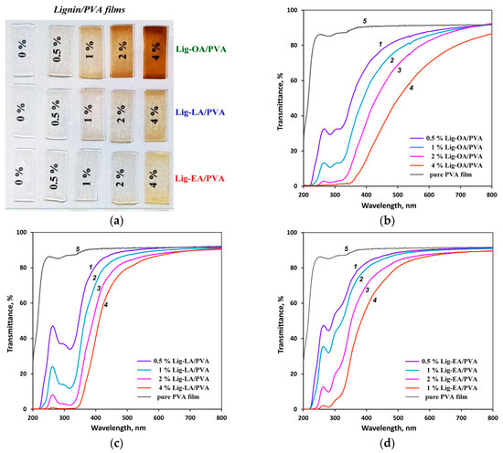 The pure PVA film transmitted 90% of ultraviolet radiation in the range of 200–400 nm. As shown in Figure 5, the inclusion of lignin in the PVA matrix significantly shields UV radiation, and the shielding efficiency increases as follows: Lig-OA > Lig-LA > Lig-EA. For all three lignins, the increase in the lignin content from 0.5 to 4% assured higher UV protection. In general, the PVA/Lig-OA and PVA/Lig-LA films showed a higher UV-shielding efficiency as compared to the PVA/Lig-EA films with the same lignin mass content (Figure 5). It is worth noting that the PVA/Lig-OA and PVA/Lig-LA films with a lignin mass content of 4% block UV radiation in the UVA range by 96% and 87%, respectively, and completely block UV radiation in the UVB range. However, the increase in the lignin content slightly worsened the visible light transparency.