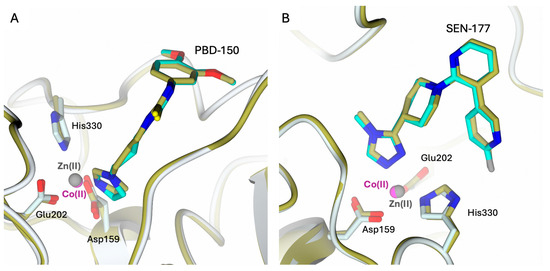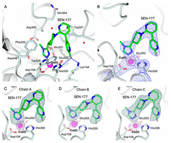 2.3. Structural Characterization of hQC-2X–Co(II) in Complex with PBD-150 and SEN-177