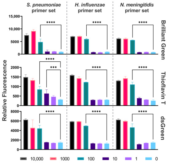 Sensitivity of DAMP assay. Relative fluorescence of the DAMP products for N. meningitidis, S. pneumoniae, and H. influenzae with different Ges, measured using Brilliant Green, Thioflavin T, and dsGreen. *** p < 0.001; **** p < 0.0001.