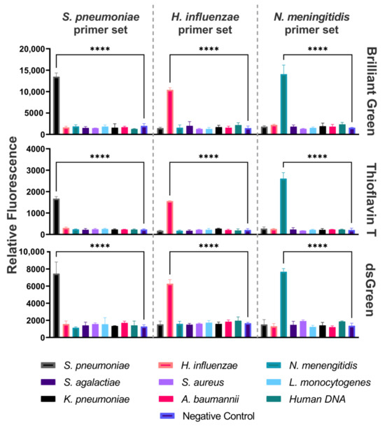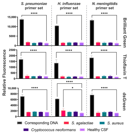Testing of the CSF clinical samples by DAMP assay. Fluorescence detection of DAMP amplicons using three primer sets on samples containing one of the pathogens: N. meningitidis, S. pneumoniae, H. influenzae, S. agalactiae, S. aureus, or C. neoformans. Relative fluorescence for each of the three primer sets using Brilliant Green, Thioflavin T, and dsGreen. * p < 0.05, **** p < 0.0001.
