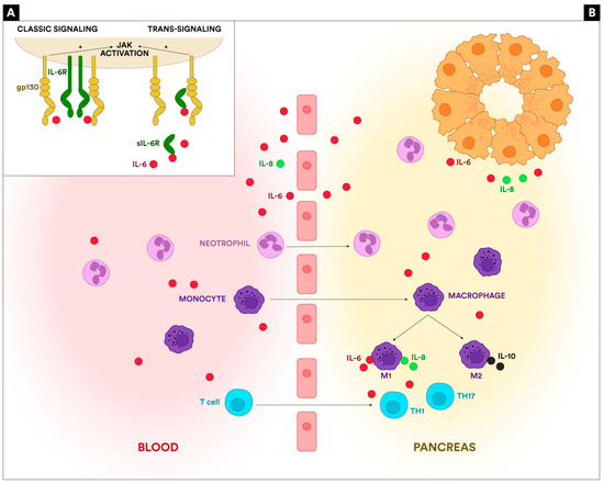 (A): The IL-6 signaling. The classic pathway can be activated on cells that express both IL-6R and gp130. The trans-signaling pathway occurs through a soluble form of IL-6R that binds IL-6 and forms a complex that can act on cells that lack the IL-6R but express gp130. Both pathways activate the JAK/STAT3 cascade. (B): The involvement of IL-6 in AP pathogenesis. IL-6 is released by the necrotic acinar cells, triggers the recruitment of inflammatory cells in the pancreas (neutrophils, monocytes, T lymphocytes), and activates the resident macrophages. IL-6 also determines the activation of Th1 and Th17 cells.