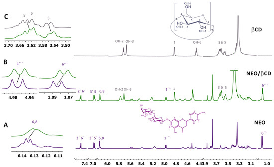 Comparison of 1H NMR spectra profile displacement of NEO/βCD (neoponcirin/beta cyclodextrin Inclusion Complex; IC) concerning NEO (neoponcirin). Drugs were dissolved in DMSO-d6. (A) ---NEO free, (B) ---IC complex, and (C) ---βCD free.