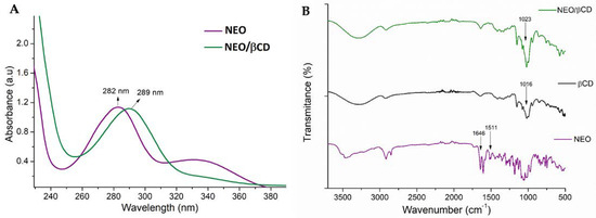 UV-Vis absorption spectra of NEO/βCD in comparison with NEO (A), FT-IR spectra of NEO (purple), βCD (black), and βCD/NEO complex (green) (B).