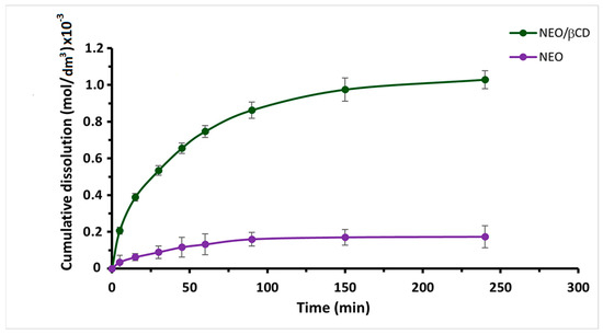The dissolution study showed a substantial difference between the dissolution profiles of NEO and the NEO/βCD complex. As shown in Figure 3, NEO alone exhibited a relatively low cumulative solubility of 3.46 × 10−5 ± 1.3 × 10−5 [mol/dm3], (12.93 ± 4.50%). In contrast, when combined with β-cyclodextrin (NEO/βCD), the solubility significantly improved, reaching a notably higher cumulative dissolution of 1.03 × 10−3 ± 4.84 × 10−5 [mol/dm3] (76.74 ± 3.619%). This considerable enhancement in dissolution indicates the effectiveness of the method used for the formation of the NEO/βCD complex, which improved the solubility and dissolution rate of NEO. However, we cannot discard the amorphization of inclusion complex contribution in this increase in solubility, presumably due to lyophilization [16].
