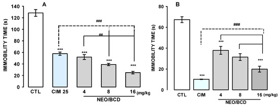 Effects of a single oral dose of NEO/βCD in the tail suspension (A) and the forced swimming (B) tests. A, NEO/βCD, CTL, control group; CMI 25, clomipramine at 25 mg/kg; and NEO/βCD, complex at different tail suspension test (TST) doses.B control group; CMI 25, clomipramine at 25 mg/kg; NEO/βCD, complex at different doses in the forced swimming test (FST). Data represent the mean ± standard error of the mean of the accumulated immobility time of groups of 8 to 10 mice each. Differences between treatments were analyzed with non-parametric Kruskal–Wallis’ one-way ANOVA (*** p ≤ 0.001) and pairwise multiple comparison procedures (Dunn’s method). Dunn’s method comparison: NEO/BCD 4 (mg/kg) vs. NEO/BCD 16 (mg/kg); ## p ≤ 0.01, and: CIM vs. NEO/BCD 16 mg/kg; ### p ≤ 0.001.