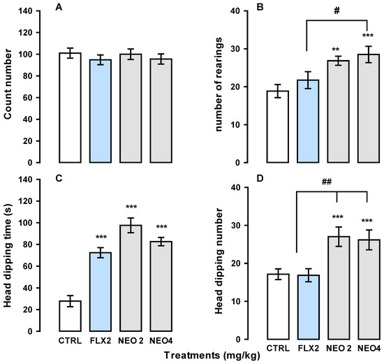 As shown in panel A, NEO/βCD and FLX did not affect the mice’s ability to walk in such a way that no treatments caused significant changes in the ambulatory activity (count number; F(3,24) = 0.43, p = 0.72), while NEO/βCD significantly increased the number of times that mice stood on their hind legs (rearing number; F(3,26) = 5.32, p = 0.005) concerning to vehicle-treated group, panel B. NEO/βCD also significantly increased both the number and the time of head dipping (F(3,24) = 7.13, p ≤ 0.001 and F(3,25) = 32.55, p ≤ 0.001, respectively). At the same time, FLX did not cause changes in these behaviors (panels C and D). Notably, no significant difference was observed between NEO/βCD at 2 and 4 mg/kg treatments (t = −0.639, p = 0.5, t = 1.88, p = 0.10, respectively).