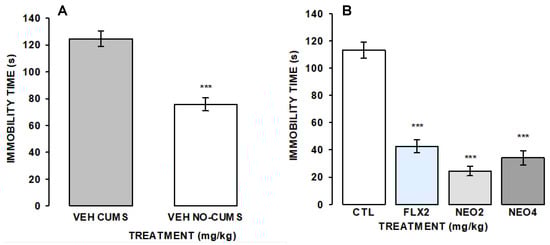 Effect of NEO/βCD on the FST of animals exposed to chronic unpredictable mild stress (CUMS). (A) Animals administered with vehicle (VEH CUMS) and exposed to CUMS (grey bar) and animals administered with the vehicle without CUMS (VEH NO-CUMS; white bar). (B) All animals’ groups were exposed to CUMS and tested in the FST at the end of the treatments. CTL, control group; FLX 2, fluoxetine at 2 mg/kg/day; NEO2, NEO/βCD at 2 mg/kg/day; NEO4, NEO/βCD at 4 mg/kg/day. Data represent the mean standard error of immobility time of groups of 7 or 8 mice, each one. Treatment effect was on depressive-like behavior was analyzed with one-way analysis of variance (ANOVA) followed by the Holm-Sidak’s method for pairwise multiple comparisons, *** p ≤ 0.001 versus the vehicle-control group.