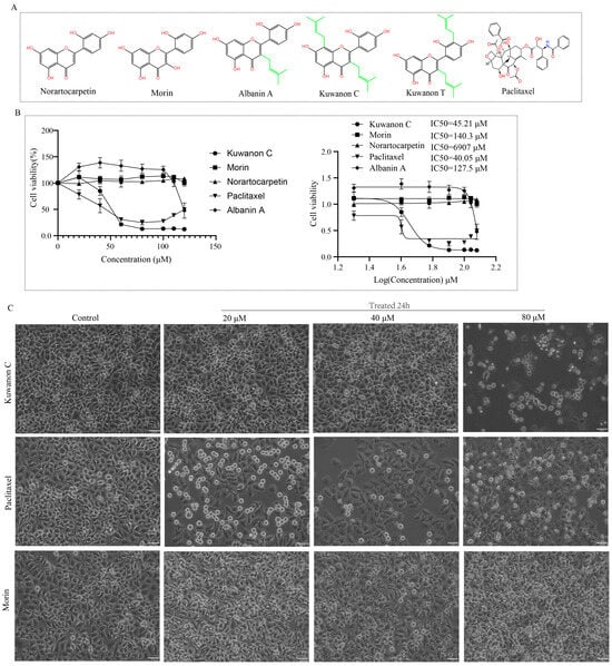 Cell viability was assayed using the CellTiter 96® AQueous One Solution Cell Proliferation Assay (MTS) method, as described in previous studies. HeLa cells (3–5 × 104) were seeded into 96-well plates and allowed to grow for 24 h. Subsequently, the cells were treated with different concentrations of kuwanon C, albanin A, morin, norartocarpetin, kuwanon T, paclitaxel, and cisplatin (ranging from 0 µM to 120 µM) for 12 h, 24 h, and 48 h. Following treatment, the medium was aspirated, and 100 µL of fresh medium was added to each well. Then, 20 µL of CellTiter 96® AQueous One Solution Reagent was added to the wells, and the plates were incubated at 37 °C, 5% CO2 for 2 h. The optical densities were measured at 490 nm using a microplate reader (Synergy H1, Burlington, Vermont, USA). The absorbance value of the control group was considered as 100% cell viability. All experiments were independently repeated three times.