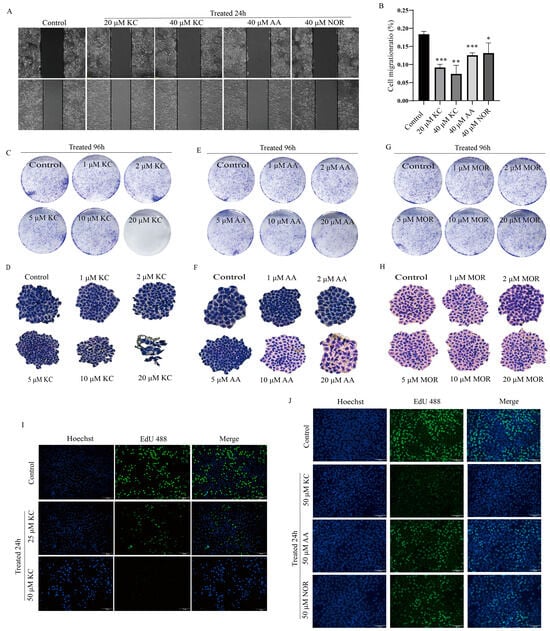 In this study, we conducted a cell scratch assay to investigate the effect of kuwanon C on HeLa cell migration after 24 h of treatment. We observed that kuwanon C exhibited a concentration-dependent inhibition of HeLa cell migration (Figure 2A,B). Interestingly, the level of inhibition was higher in kuwanon C, which contains two isopentenyl groups, compared to albanin A with one isopentenyl group and norartocarpetin without an isopentenyl group. Notably, at 40 μM, albanin A promoted HeLa cell migration, while norartocarpetin had no inhibitory effect (Figure 2A,B). Furthermore, we performed a plate clone formation assay to assess the effect of different concentrations (0 μM (control), 1 μM, 2 μM, 5 μM, 10 μM, 20 μM) of kuwanon C, albanin A, and morin on HeLa cell clone formation. Our results revealed that at 20 μM, kuwanon C significantly inhibited the clone formation ability of HeLa cells, while albanin A and morin had no impact (Figure 2C–H). Additionally, we conducted an EdU 488 cell proliferation staining assay following a 24 h treatment with kuwanon C. The staining results demonstrated that kuwanon C inhibited the proliferation of HeLa cells in a concentration-dependent manner (Figure 2I). Moreover, when HeLa cells were simultaneously treated with 50 μM of kuwanon C, albanin A, and norartocarpetin for 24 h, only kuwanon C exhibited an inhibitory effect on HeLa cell proliferation (Figure 2J).