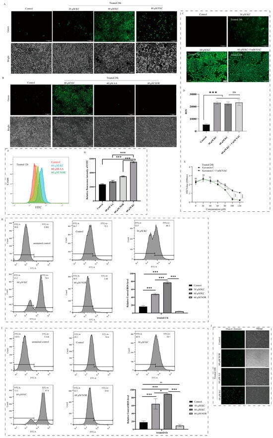Induction of reactive oxygen species generation in HeLa cells by kuwanon C. (A,B) HeLa cells were treated with kuwanon C (KC), albanin A (AA), norartocarpetin (NOR), and paclitaxel (PAC) for 24 h. Subsequently, the cells were exposed to a ROS detection reagent, and the levels of ROS were measured using fluorescence microscopy. (C,D) Treatment of HeLa cells with 60 μM kuwanon C in the presence of 5 mM of the antioxidant N-Acetylcysteine (NAC). (E) Cell viability assay, effect of antioxidant NAC on cell viability after kuwanon C treatment of HeLa. (F,G) Flavonoid compounds with different numbers of isopentenyl groups, kuwanon C, AA, and NOR, were treated with HeLa cells for 12 h and intracellular reactive oxygen species levels were measured by flow cytometry. (H,I) The HeLa cells were treated with different concentrations of kuwanon C (0, 30 μM, 60 μM) and 60 μM NOR for 3 h and 6 h, respectively, and then the intracellular levels of reactive oxygen species were detected by flow cytometry. (J) Intracellular calcium imaging. Green fluorescence serves as an indicator of increased intracellular calcium ion concentration. Scale bar = 200 μm. Each bar represents the mean ± SD of three independent experiments. Statistical significance is indicated by * p < 0.05, *** p < 0.001 and ns: not significant.