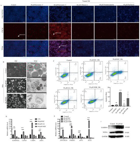 Induction of apoptosis in HeLa cells by kuwanon C. (A) Apoptosis and necrosis staining was used to detect the apoptosis and necrosis level of HeLa cells treated with 0 μM (control), 30 μM, 60 μM of kuwanon C, albanin A, norartocarpetin, and paclitaxel for 24 h. (Red arrows indicate apoptotic cells, and white arrows indicate necrotic cells). Scale bar = 200 μm. (B) The impact of kuwanon C on the microstructure of HeLa cells. HeLa cells were treated with 0 μM, 60 μM, and 80 μM kuwanon C and examined using transmission electron microscopy. Scale bar = 10 μm. (C) Flow cytometry was performed to detect the apoptosis level of HeLa cells after treatment with different concentrations (control, 25 μM, 50 μM) of kuwanon C, albanin A (50 μM), and norartocarpetin (50 μM) for 24 h. (D,E) The expression levels of apoptosis-related genes (GADD45A, Casp3, Casp4, ERN1, PPP1R15A, PMAIP1, ATF3, and IFIT2) were quantified using (RT-qPCR). (F) Western blotting detection of protein levels of apoptosis-related proteins GADD34, NOXA. Each bar represents the mean ± SD of three independent experiments. Statistical significance is indicated by * p < 0.05, ** p < 0.01, *** p < 0.001 and ns: not significant.