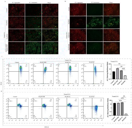 Kuwanon C decreases mitochondrial membrane potential. (A) Changes in cell membrane potential were assessed using JC-1 staining, where strong red fluorescence indicated high membrane potential and vice versa. Scale bar = 50 μm. (B) The impact of kuwanon C (KC), albanin A (AA), and norartocarpetin (NOR) on HeLa cell membrane potential was detected using JC-1 staining. HeLa cells were treated with the same concentrations (60 μM) of each compound for 24 h. Scale bar = 50 μm. (C,D) Flow cytometry was performed to measure the mitochondrial membrane potential levels in HeLa cells treated with kuwanon C (KC), albanin A (AA), and norartocarpetin (NOR) for 12 and 24 h, respectively. Each bar represents the mean ± SD of three independent experiments. Statistical significance is indicated by ** p < 0.01, *** p < 0.001.