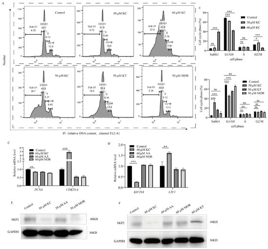 Modulation of the cell cycle by kuwanon C in HeLa cells. (A,B) Flow cytometry was performed to investigate the impact of kuwanon C (KC: 30 μM, 50 μM, and 60 μM), kuwanon T (KT, 50 μM), and morin (MOR, 50 μM) on the cell cycle of HeLa cells following a 24 h treatment. (C,D) Analysis of the expression levels of cell cycle-related genes (PCNA, CDKN1A, KIF20A, E2F1) by differences in the number of isopentenyl groups of flavonoid compounds (kuwanon C, albanin A, norartocarpetin). (E,F) The expression levels of cycle-related proteins were evaluated by Western blotting, with GAPDH serving as the internal reference. Specifically, the protein levels of SKP2, which are involved in DNA synthesis and replication, were investigated. Each bar represents the mean ± SD of three independent experiments. Statistical significance is indicated by * p < 0.05, ** p < 0.01, *** p < 0.001 and ns: not significant.