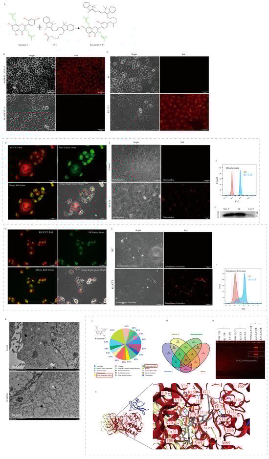Molecular targets of kuwanon C. (A) Kuwanon C was labeled with the red fluorescent moiety CY3. (B,C) Upon treatment of HeLa cells with kuwanon C-CY3, CY3, and kuwanon C, only the cells in the kuwanon C-CY3 treatment group emitted red fluorescence. Scale bar = 50 μm. (D,H) HeLa cells were treated with CY3-labeled kuwanon C for 24 h, followed by labeling with green fluorescent probes targeting mitochondria and endoplasmic reticulum. Fluorescence microscopy was utilized to visualize the binding site of kuwanon C. (E,I) The extracted organelles of mitochondria and endoplasmic reticulum were observed and characterized through fluorescence microscope examination. (F,J) Flow cytometry analysis was conducted to assess the extracted organelles from the kuwanon C-CY3 and kuwanon C-treated groups. (G) Western blotting was performed to further verify the presence of kuwanon C in the extracted organelles. (K) The status of the endoplasmic reticulum and mitochondria in HeLa cells was observed using transmission electron microscopy (Scale bar = 1 μm; Abbreviations used: endoplasmic reticulum: E, mitochondria: M, nucleus: N). (L) The prediction of kuwanon C target proteins. (M) Venn analysis of the target proteins of kuwanon C, albanin A, norartocarpetin, and morin. (The proteins shown in red box are a family of membrane proteins to which Kuwanon C may bind.) (N) Non-denaturing PAGE electrophoresis experiments were conducted using extracted organelles and total proteins from HeLa cells treated with kuwanon C-CY3. (O) Molecular docking analysis of kuwanon C with target cycle-associated protein CDK1 (Abbreviations used: kuwanon C: KC; albanin A: AA; norartocarpetin: NOR; cyclin-dependent kinase 1: CDK1; mitochondria: Mito; total protein: TP; cytoplasm protein: CP).