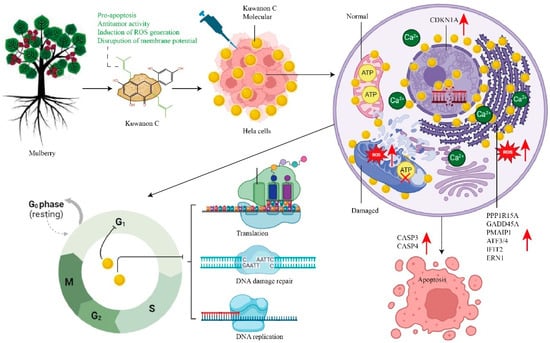 Our study demonstrates that kuwanon C, an isopentenyl flavonoid obtained from the root bark of mulberry, exerts potent antitumor effects. Through its interaction with the mitochondrial and endoplasmic reticulum membranes, kuwanon C induces a significant production of ROS, leading to the disruption of their normal structure. This disruption alters ATP production, impairs protein synthesis and processing, and inhibits cell cycle progression. Moreover, kuwanon C stimulates apoptotic signaling pathways, ultimately resulting in the death of HeLa tumor cells. Furthermore, we observed anti-proliferative and pro-apoptotic effects of kuwanon C on breast cancer and brain tumor cells.