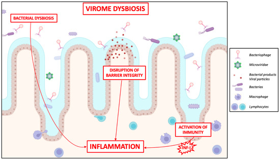 The virome dysbiosis may contribute to IBD pathogenesis through various pathways, including the regulation of gut bacterial populations, alterations in intestinal barrier integrity, and, consequently, the modulation of pro-inflammatory actions and local immune responses (Figure 2).