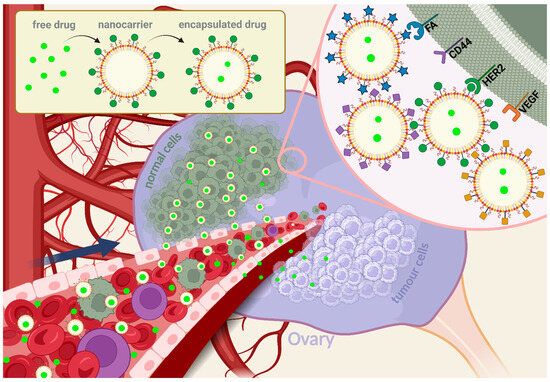 However, the rate of leakage from vessels is slow, and the drug may be metabolised or excreted before therapeutic levels are reached [22,23]. Active targeting is achieved by functionalisation of nanoparticles with targeted surface receptors that are highly expressed in tumour cells, such as human epidermal growth factor 2 (HER2), folic acid (FA), CD44 (also referred to as homing cell adhesion molecule, HCAM), or vascular endothelial growth factor (VEGF) in ovarian cancer, is a more specific strategy (Figure 3). This process takes advantage of aberrant expression of cell surface proteins, allows increased internalisation by cancer cells, and has been shown to bypass drug efflux by P-glycoprotein, also known as multidrug resistance protein 1 (P-gp or MDR1), thereby overcoming chemoresistance and improving the therapeutic response [24,25,26].