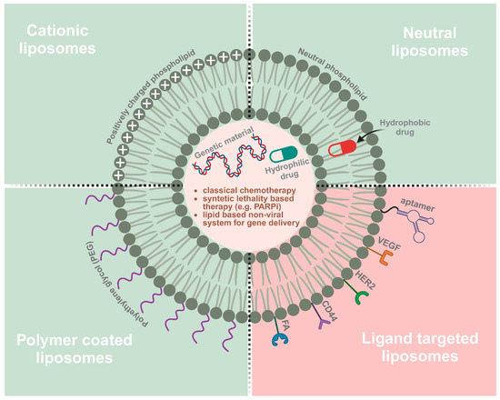 Liposomes are the most extensively explored as nanocarriers for targeted drug delivery. These spherical phospholipid structures contain hydrophilic cores surrounded by a bilayer composed of amphiphilic lipid materials that facilitate the entrapment of both lipophilic and hydrophilic molecules. Hydrophobic compounds are inserted into the bilayer membrane, while hydrophilic compounds are captured in the aqueous interior [30,31]. Liposomes can also be divided into four major groups: neutral, cationic, pegylated, and ligand-targeted liposomes (Figure 4). Cationic liposomes can undergo stabilising electrostatic interactions with negatively charged nucleic acids and cell membranes to improve the transportation of large DNA or RNA. This structure limits the aggregation of liposomes in the blood [32]. Neutral liposomes reduce protein binding and uptake efficiency by endothelial cells to increase the plasma circulation time of the gene carrier. The lack of surface charge limits stability by increasing the aggregation of liposomes in the blood [33]. Leaky vasculature at the tumour site promotes the accumulation and activity of liposomes [34]. Polyethylene glycol (PEG)-modified liposomal doxorubicin (PLD) (Caelyx in Europe and Canada; Doxil in the USA) was the first nanodrug approved by the Food and Drug Administration (FDA) in 1995 for the treatment of ovarian cancer and multiple myeloma. PLD was approved by the FDA in 1999 and the European Medicines Agency (EMA) in 2000 as a single agent for advanced ovarian cancer patients who failed first-line platinum-based treatment [35,36]. Coating liposomes with synthetic polymers such as PEG is a crucial step in improving their properties as nanocarriers. The hydrophilic layer formed by the thick PEG head groups acts as a barrier to prevent interactions with plasma opsonins, thus increasing the longevity of the nanoparticles and prolonging their circulation time [37,38]. An earlier meta-analysis of randomised clinical trials demonstrated that PLD was equally as effective as other monotherapies and more tolerable in ovarian cancer patients. Furthermore, co-treatment with carboplatin and PLD was linked to longer progression-free survival (PFS), but similar overall survival (OS) relative to a combination of carboplatin and paclitaxel (PTX) used as standard ovarian cancer therapy. However, the drug combinations displayed distinct toxicity profiles. Patients receiving PLD and carboplatin experienced lower neuropathy, alopecia, and neutropenia, but had greater gastrointestinal toxicity, anaemia, and cutaneous toxicity [39]. Examples of clinical trials using PLD in combination with other agents are shown in Table 1.