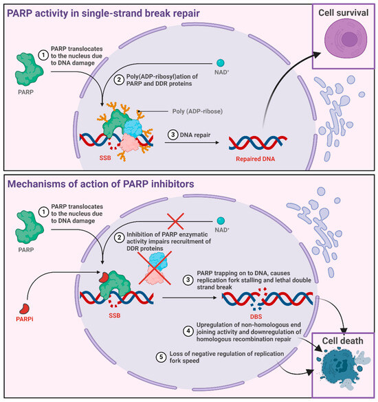 PARPi compounds exhibit anticancer activity; however, the underlying mechanisms are complex and incompletely understood. Initially, it was proposed that inhibiting SSBs repair could induce lethality. However, conflicting evidence supports alternative pathways [130,131]. Replication fork stalling and PARP trapping have emerged as prominent theories, implicating the disruption of replication forks and competitive binding of PARPi to the NAD+ binding domain of PARPI. This trapping mechanism, linked to DNA lesions, contributes to the formation of DSBs and stalled replication forks in HR-deficient tumours (Figure 5) [132,133].