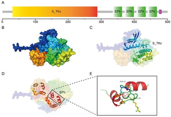 GhCDPK16 possesses typical characteristics of CDPK proteins. (A) Conservative domains of GhCDPK16 protein. (B) Model of the GhCDPK16 protein predicted by AlphaFold3. (C,D) Cartoon of S_TKc (C) and EFh (D) structures. (E) Docking of Ca2+ in the EFh domain of GhCDPK16.