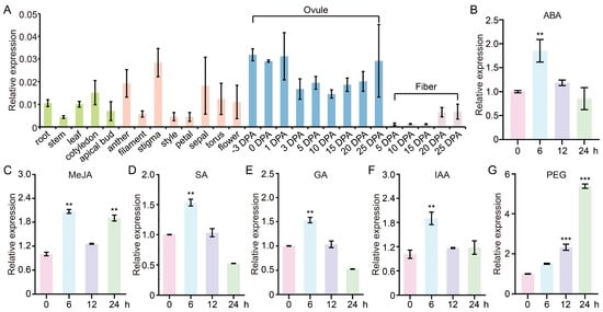 Expression analysis of GhCDPK16 during cotton development and hormone treatment. (A) The expression profile of GhCDPK16 in different tissues. (B–F) Transcription level of GhCDPK16 in leaves of cotton after ABA (B), MeJA (C), SA (D), GA (E), and IAA (F) treatments. (G) Expression patterns of GhCDPK16 under PEG-induced drought stress. Values represented the mean ± SD from three biological replicates. ** p < 0.01 and *** p < 0.001 by Student’s t test.