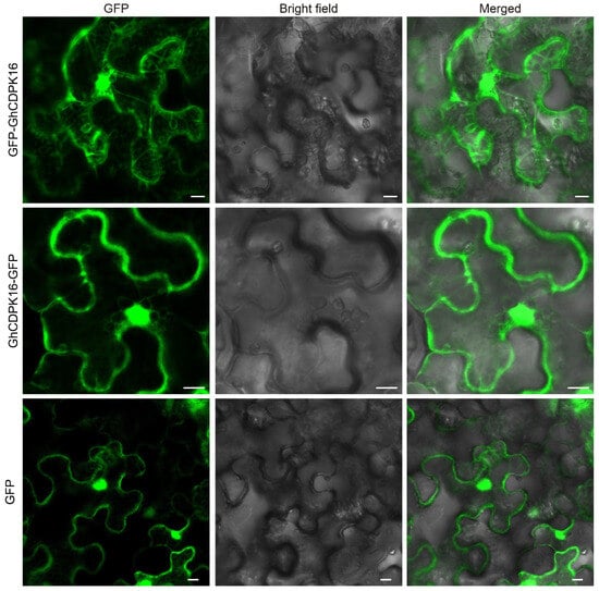 CDPKs were predicted to localize on multiple cellular compartments, including the endoplasmic reticulum, plasma membrane, and cytoplasm, as well as in the nucleus []. Most CDPKs contain both an N-myristoylation site and a palmitoylation site, which together determine their subcellular distribution []. We used GPS-Lipid 1.0 [] to predict the N-myristoylation and palmitoylation sites of GhCDPK16, revealing that GhCDPK16 has only one palmitoylation site at the N-terminus. Previous studies have indicated that CDPK proteins lacking one or both N-acylation sites were primarily localized in the cytoplasm and nucleus []. To confirm the subcellular localization of GhCDPK16, GFP was fused to the N-terminus or C-terminus of the GhCDPK16 protein under the constitutive CaMV35S promoter. Transient expression was conducted in tobacco leaves using Agrobacterium infiltration, with a free GFP vector used as a positive control (Figure 3). Results indicated that free GFP localized to the cell membrane, cytoplasm, and nucleus, while GFP-GhCDPK16 and GhCDPK16-GFP were both localized in the cytoplasm and nucleus (Figure 3). These findings demonstrated that the fusion of GFP to either the N-terminus or C-terminus of GhCDPK16 did not alter its subcellular localization and GhCDPK16 functions in the cytoplasm and nucleus.