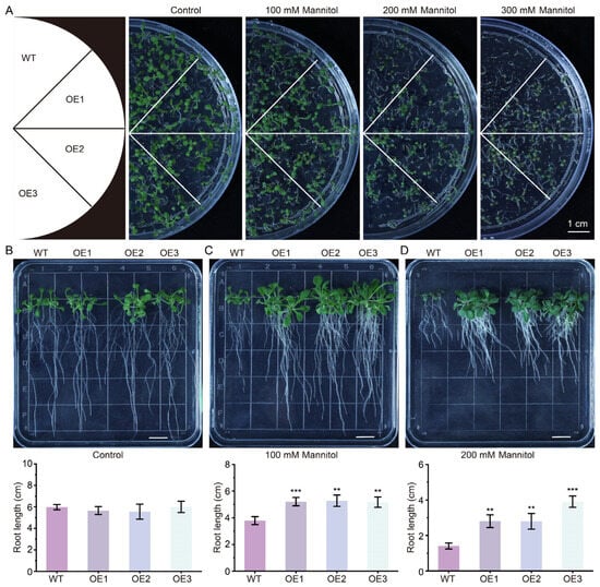 Overexpression of GhCDPK16 increased drought resistance in Arabidopsis. (A) Seed germination of wild-type (WT) and GhCDPK16-overexpressing Arabidopsis on 1/2 MS agar plates with 0 mM, 100 mM, 200 mM, and 300 mM mannitol. Photographs were taken one week after mannitol treatments. OE1–OE3 represented independent homozygous Arabidopsis lines overexpressing GhCDPK16. Bars = 1 cm. (B–D) Phenotypes of WT and overexpressing lines after 10 days of treatment with 0 mM (B), 100 mM (C), and 200 mM (D) mannitol, and the statistics of primary root length under different concentration of mannitol treatments. Bars = 1 cm. Values represented the mean ± SD from three biological replicates. ** p < 0.01 and *** p < 0.001 by Student’s t test.