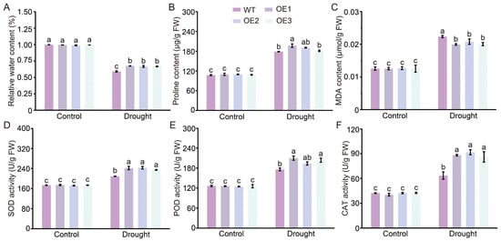 Overexpression of GhCDPK16 enhanced antioxidant capacity and water retention ability. (A–C) The analysis of the relative water content (A), proline content (B), and MDA content (C) of WT and transgenic lines with or without drought treatment for 10 days. (D–F) Measurements of SOD (D), POD (E), and CAT (F) activities in leaves with WT and GhCDPK16-overexpressing lines after drought treatment. OE1–OE3 represented independent homozygous Arabidopsis lines overexpressing GhCDPK16. Values represented the mean ± SD from three biological replicates. Columns with different letters indicated significant differences (p < 0.05, Student’s t test).