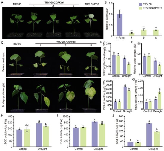Silencing of GhCDPK16 reduced drought tolerance in cotton. (A) Phenotypes of control and GhCDPK16-silenced plants via VIGS technology. The GhPDS gene was used as a marker, revealing an albino leaf phenotype following VIGS in cotton. Numbers 1 to 3 represented three distinct plants. (B) Relative expression levels of GhCDPK16 in control and TRV:GhCDPK16 plants. (C) Phenotypes of control and GhCDPK16-silenced plants before and after drought treatment. (D–J) The analysis of chlorophyll content (D), relative water content (E), proline content (F), MDA content (G), and activities of SOD (H), POD (I), and CAT (J) in control and GhCDPK16-silenced plants leaves after drought treatment. Values represent the mean ± SD from three biological replicates. ** p < 0.01 by Student’s t test. Columns with different letters indicate significant differences (p < 0.05, Student’s t test).