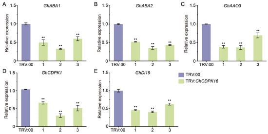 Expression levels of abiotic stress-related genes in control plants and GhCDPK16-silenced plants. (A–E) Relative expression levels of several ABA-related genes, including GhABA1 (A), GhABA2 (B), GhAAO3 (C), GhCDPK1 (D), and GhDi19 (E) in control and GhCDPK16-silenced plants after drought treatment. Numbers 1 to 3 represented three distinct GhCDPK16-silenced plants. Values represent the mean ± SD from three biological replicates. ** p < 0.01 by Student’s t test.