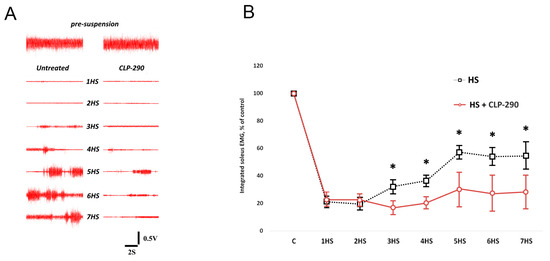 An example of a soleus muscle EMG in the experimental groups (A). EMG time-course for hindlimb-suspended rats with either the placebo or CLP-290 administration (B). *—significant differences from the HS group.