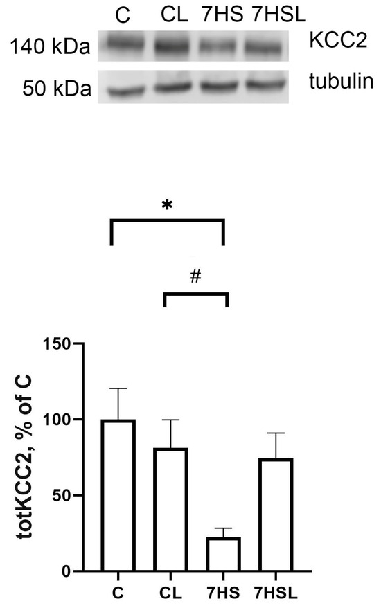 The content of KCC2 in the spinal cord tissue samples of the experimental animals did not differ between the C and CL groups, while in the 7HS group, the KCC2 content was significantly lower compared with the C and CL groups. The content of KCC2 in the 7HSL group did not significantly differ from any other experimental group (Figure 2).