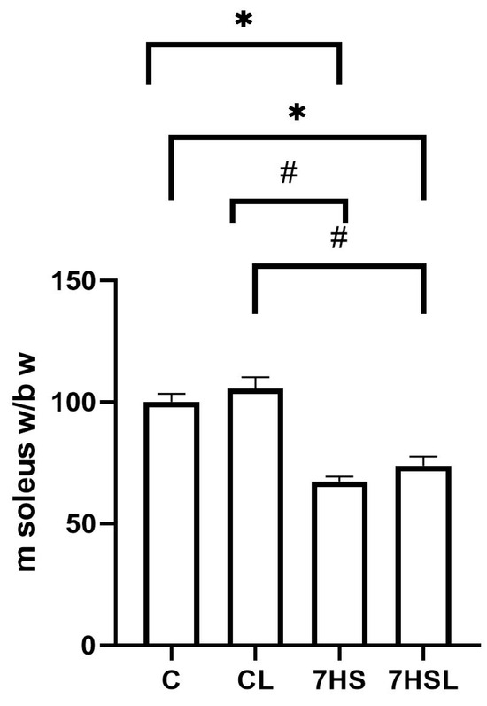 Soleus muscle weight, normalized to the body weight of the experimental animals. The data are represented as a percentage of the C group mean value ± SEM. C—vivarium control, CL—control group with CLP-290, 7HS—7-day hindlimb-suspended group, 7HSL—7-day hindlimb-suspended group with CLP-290. *—significant differences from the C group; #—significant differences from the CL group.
