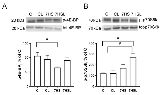 The contents of p-4E-BP and p-p70s6k, which are both mTOR downstream targets, did not differ between the C and CL groups (Figure 5). In the 7HS group, the content of p-4E-BP was significantly lower than in the C group, while the content of p-p70S6k did not differ from both the control groups, C and CL. The content of p-4E-BP in the 7HSL group did not differ from any other experimental group, and the content of p-p70S6k in the 7HSL group was significantly higher than in the C and CL groups (Figure 5).