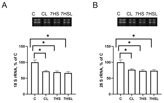 The contents of both the 18S rRNA and 28S rRNA were significantly lower in the CL, 7HS, and 7HSL groups compared to the C group, while the rRNA content did not differ among the three mentioned groups (Figure 6A,B).