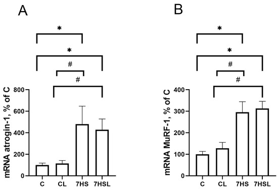 The mRNA expression of the key E3 ubiquitin ligases mediating muscle proteolysis, MuRF-1 and Atrogin-1, did not differ between the C and CL groups, while in both hindlimb-suspended groups, their mRNA expression was significantly higher than in the control groups (Figure 7). Both the MuRF-1 and Atrogin-1 mRNA expression levels did not differ between both suspension groups of 7HS and 7HSL (Figure 7A,B).