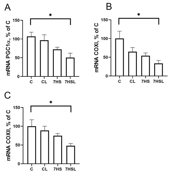 There were no significant differences in the mRNA expression of the mitochondrial biogenesis regulator PGC1α and its downstream targets, COXI and COXII, across the experimental groups, except for the significant downregulation of all three parameters in the 7HSL group compared with the C group (Figure 8A–C).