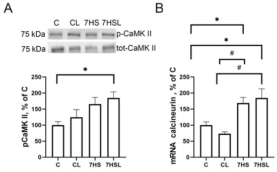 The content of p-CaMK II did not differ among the experimental groups, except for its significantly higher content in the 7HSL group compared to the C group (Figure 10A). The mRNA expression of calcineurin A was significantly higher in the 7HS and 7HSL groups compared to the C and CL groups, while the C and CL groups did not differ from one another, and neither did the 7HS and 7HSL groups (Figure 10B).