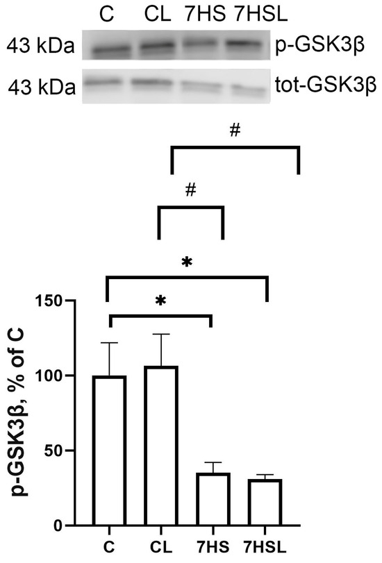 p-GSK3β content. The data are represented as a percentage of the C group mean value ± SEM. C—vivarium control, CL—control group with CLP-290, 7HS—7-day hindlimb-suspended group, 7HSL—7-day hindlimb-suspended group with CLP-290. *—significant differences from the C group; #—significant differences from the CL group.