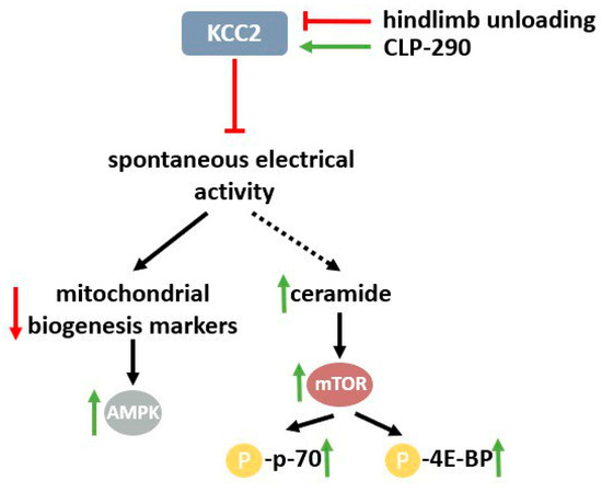 Altogether, we can conclude that the blocking of delayed-onset soleus muscle activity via KCC2 activation leads to the downregulation of AMPK downstream (p-ACC) and the upregulation of mTOR targets (p-p70S6k and p-4E-BP), but this neither prevents nor enhances atrophy of the soleus muscle or myofiber CSA. The signaling effects of CLP-290 in the unloaded soleus muscle are summarized in Figure 12.