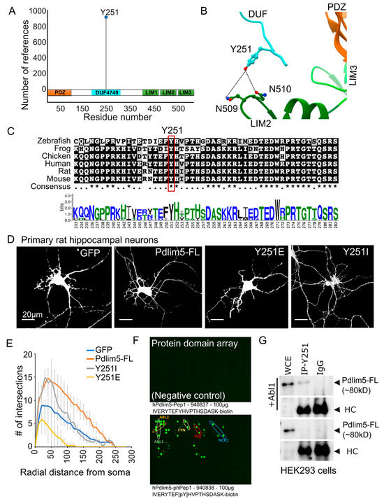 DUF domain cross-species conservation and phosphorylation at residue Y251. (A) Figure from PhosphoSitePlus depicting Pdlim5’s three principal domains, highlighting the phosphorylation of Y251 in the central DUF domain. The X axis indicates amino acid residue positions, and the Y axis represents the total number of references available on the PhosphoSitePlus website. (B) AlphaFold modeling of Pdlim5 with a focus on Y251 in the central DUF domain. Within the larger Pdlim5 folded structure, AlphaFold predicts the proximity of Y251 to two asparagine residues in the LIM2 domains. (C) Amino acid sequence alignment indicates the conservation of Y251 across vertebrate species, as well as the conservation of the closely surrounding part of the larger DUF domain. (D) Binary images of primary rat hippocampal cells following the expression of the point mutants Y251E or Y251I, relative to the expression of GFP or Pdlim5. Results show a significant decrease in dendritic branching upon expression of Y251E, while Y251I exhibited a more modest effect. (E) X-axis represents radial distance from soma in micrometer (µm) while Y axis shows number (#) of intersection. Sholl analysis quantifying the impact of the Y251E or Y251I mutants on neurite morphological characteristics. At least 15 neurons from three biological replicates were consolidated for the Sholl analysis. The significance was assessed using a two-way ANOVA (mixed-effect model for missing values and including repeated measures) with Bonferroni post hoc analysis that varies from p ≤ 0.0001 to p < 0.05, based on radial distance from the cell soma (compared to cells expressing GFP alone and Pdlim5-FL). Scale bars in the images represent 20 µm. (F) Data from a SH2 peptide domain array from proteins that are known to have selective capacities to bind phospho-residues. The array, described in the methods, was probed with DUF domain peptides surrounding the Y251 phosphorylation site. The top panel shows the binding profile of the unphosphorylated peptide-IVERYTEFYHVPTHSDASK-biotin, and the bottom panel shows the binding profile of the phosphorylated peptide-IVERYTEF[pY]HVPTHSDASK-biotin. Bound peptides were detected with streptavidin-Cy3. (G) Immunoblot of immunoprecipitates from HEK-293 cells expressing exogenous Abl1 kinase (top panel) versus not expressing exogenous Abl1 (lower panel). Antibodies selectively directed against phospho-Y251 within Pdlim5 were used for the initial pull-down followed by immunoblotting for Pdlim5.