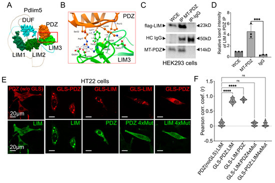 Intra-molecular interactions of Pdlim5 are suggested via IP, IF, and AlphaFold evidence. (A) AlphaFold predicted model of the Pdlim5 folded structure showing the PDZ (orange), DUF (cyan), and LIM (green) domains. The red box indicates a PDZ/LIM domain interface expanded in Panel (B). (B) Predicted molecular interface between the PDZ/LIM domains, identifying predicted interacting residues that form the basis of subsequent point mutations. (C) Following their exogenous co-expression in HEK-293 cells, flag-tagged isolated LIM domain co-precipitates with pull-downs of the isolated myc-tagged PDZ domain that are shown quantified in Panel (D). (D) Quantitation of co-immunoprecipitation band intensities from Panel (C), representing flag-LIM in MT-PDZ pull-down assays. Each dot represents one biological replicate. The error bars represent the SEM. The statistical significance, determined using one-way ANOVA, is indicated as p ≤ 0.0001 (***). (E) Golgi co-relocalization assays in HT-22 cells. The isolated PDZ or LIM domain of Pdlim5 when fused to a Golgi localization sequence (GLS) leads to its (red) punctate distribution at the Golgi, as expected. Experimentally, when GLS-PDZ is co-expressed with the isolated LIM domain of Pdlim5 (second image in the lower subpanel), this leads to LIM’s Golgi co-relocalization with GLS-PDZ. As predicted based on AlphaFold (Panel (B)), 4× point mutants of either the isolated PDZ or LIM domains fail to co-relocalize. In negative-control conditions, when PDZ lacks the GLS, it is no longer directed to the Golgi and becomes more diffuse/cytoplasmic (first image upper subpanel). In this case, the isolated LIM domain likewise no longer co-relocalizes with PDZ to the Golgi. Scale bars in the images represent 20 μm. (F) Quantitation of Golgi co-relocalization assays based on images as shown in Panel (E). Pearson’s correlation coefficient indicates co-distribution of PDZ/LIM to the Golgi under experimental conditions where either of the isolated PDZ or LIM domains is fused to a GLS. In contrast, the corresponding 4× point mutants of the isolated PDZ or LIM domains show a loss of such ectopic co-relocalization. The violin plot quartiles (dotted lines) indicate data ranges where the middle dark line represents the median. Statistical significance is determined using one-way ANOVA and indicated as p ≤ 0.0001 (****) or ns (not significant).