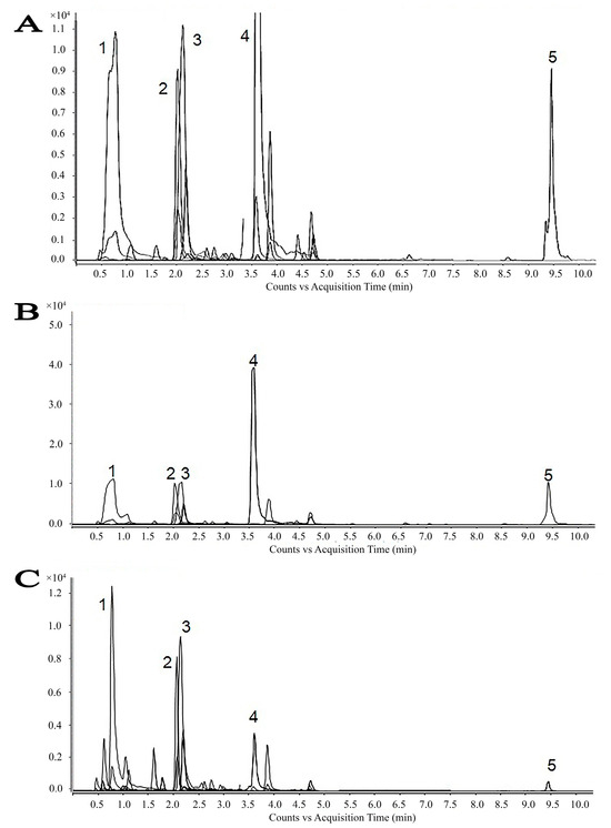 HPLC chromatograms of acetonic, ethanolic, and aqueous extracts of yellow bedstraw. 1—chlorogenic acid; 2—cynaroside; 3—isoquercetin; 4—Quercetin; 5—ursolic acid. (A) Chromatogram of yellow bedstraw acetonic extract; (B) chromatogram of yellow bedstraw ethanolic extract; and (C) chromatogram of yellow bedstraw aqueous extract.